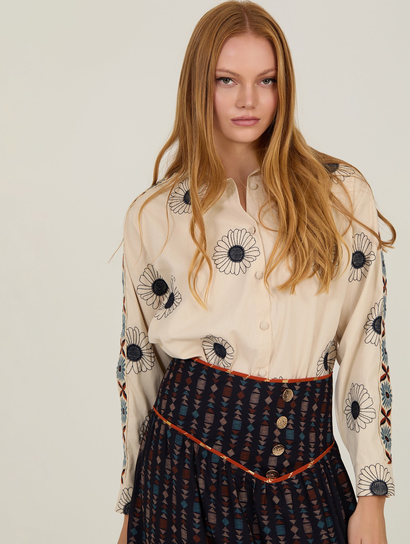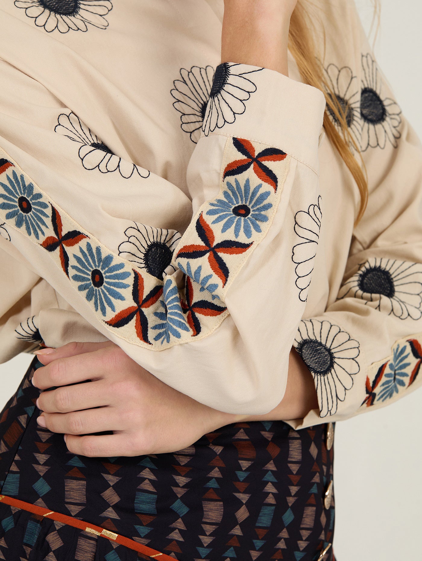 La camisa de Meisie es pura alegría y artesanía hecha prenda. Confeccionada en un suave algodón color crema, destaca por sus bordados florales multicolor que recorren el frente y las mangas, creando un contraste vibrante lleno de personalidad.