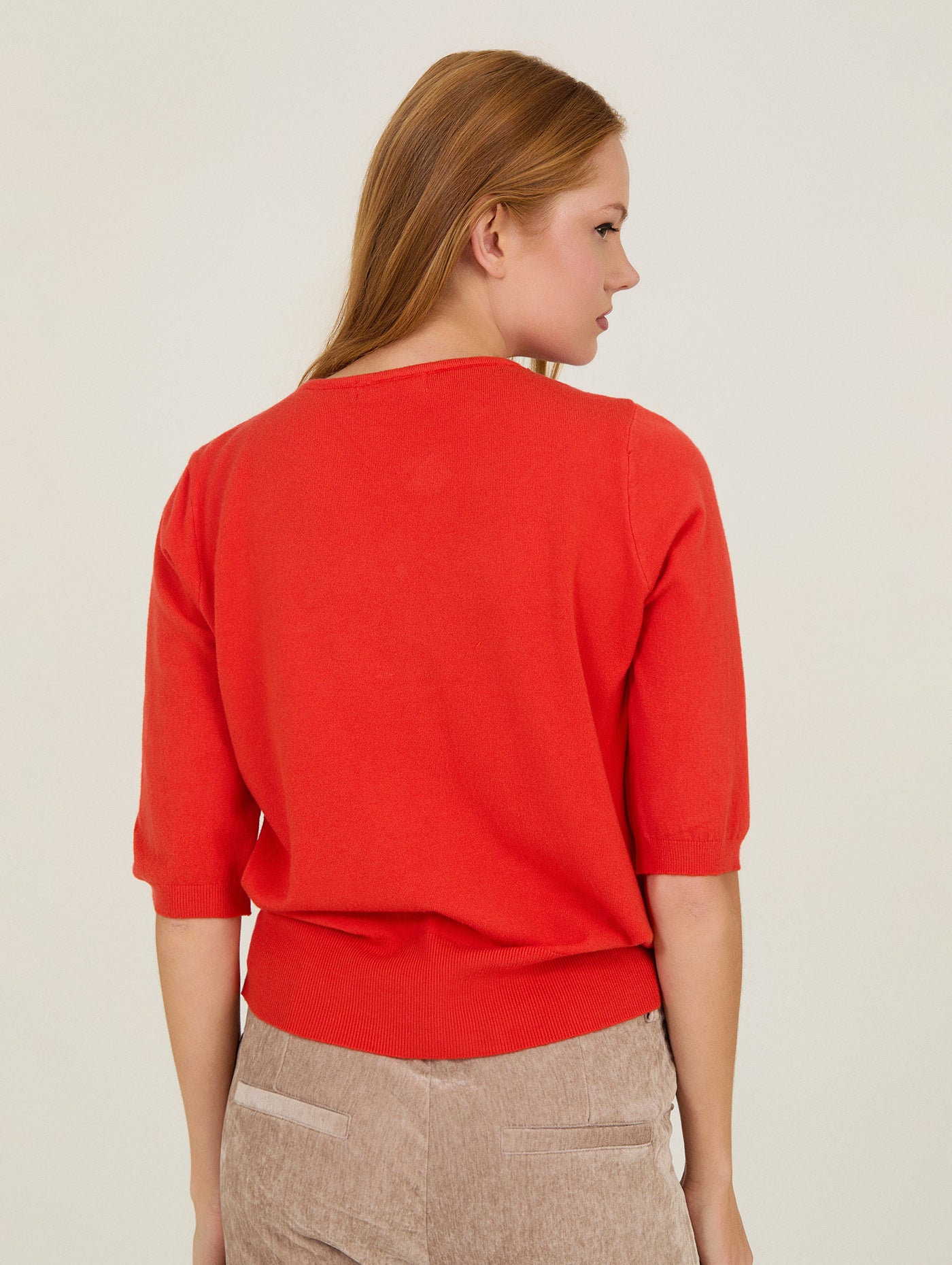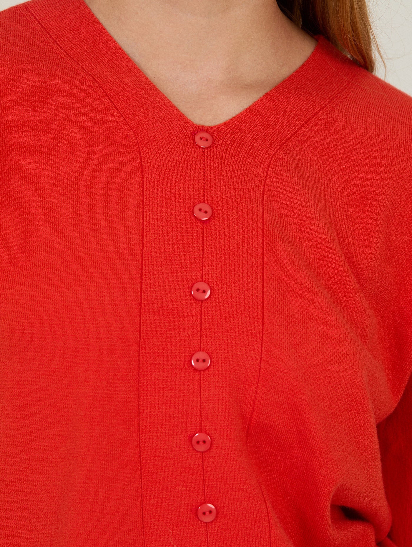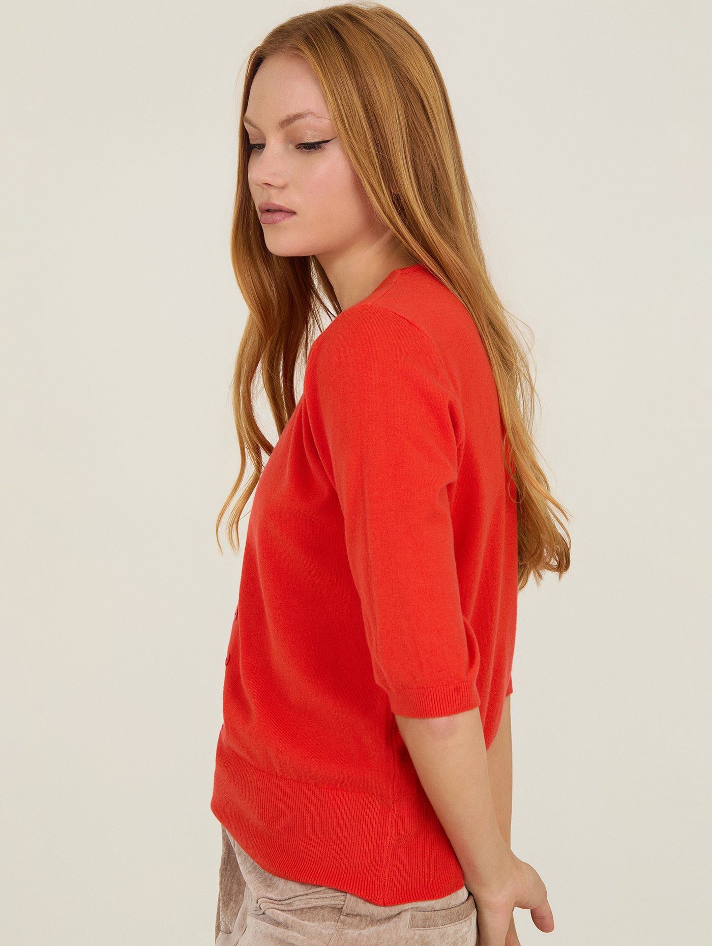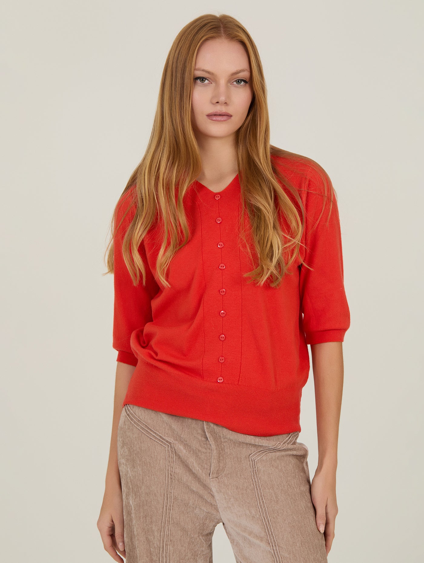 Confeccionado en un tejido de punto fino y suave, presenta un cuello en “V” y botones al tono, además de manga corta tipo media que estiliza los brazos y lo convierte en la opción ideal para los meses de entretiempo. Su diseño limpio, con detalles verticales sutiles en el frontal, aporta un efecto visual favorecedor y un aire sofisticado sin esfuerzo.