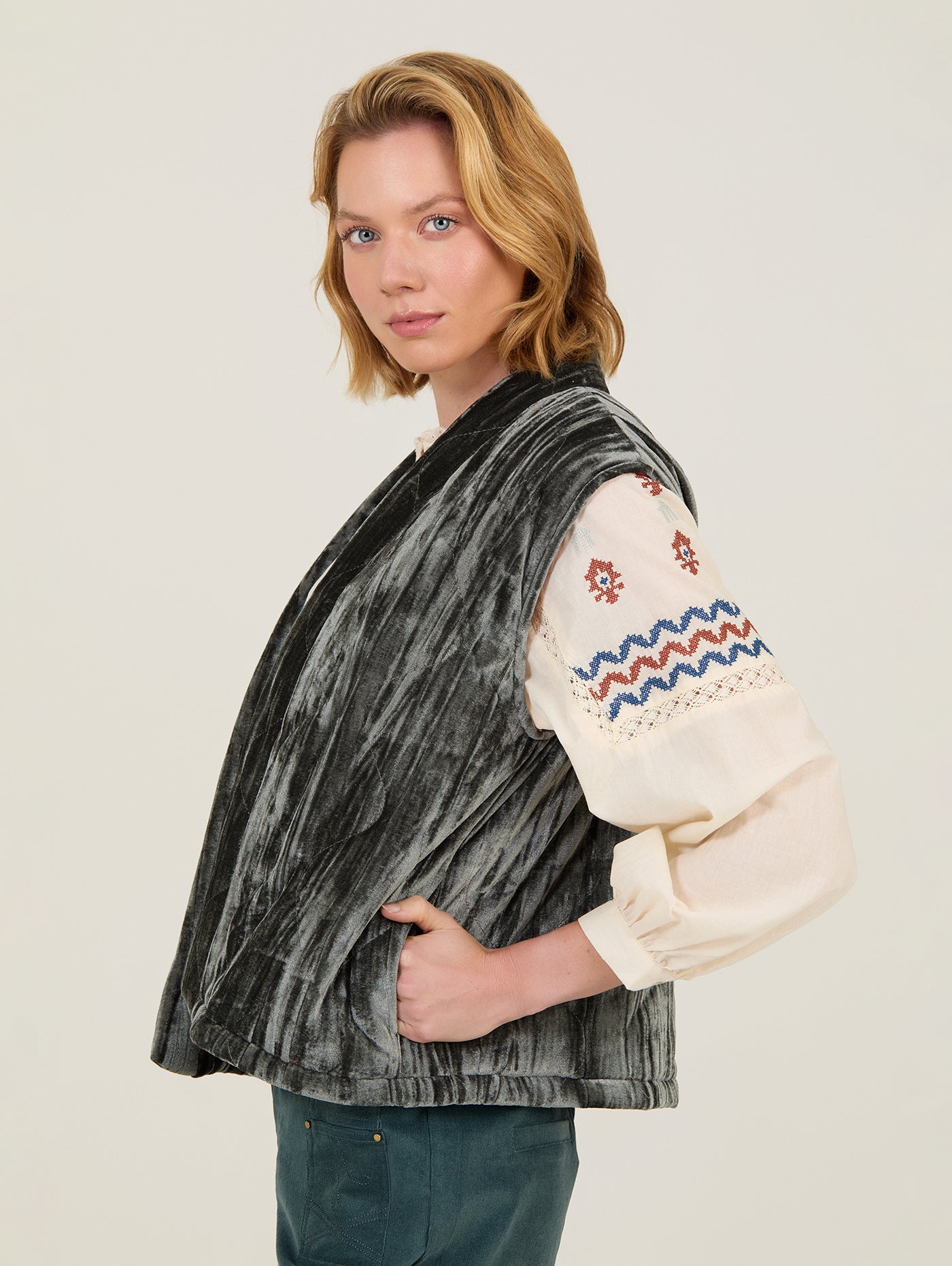 Su diseño acolchado, sin cierre y de corte recto y relajado, lo convierte en un básico versátil para superponer sobre camisas bordadas, blusas románticas o jerséis de punto. Ideal para crear looks con textura y carácter, combinando confort y estilo.