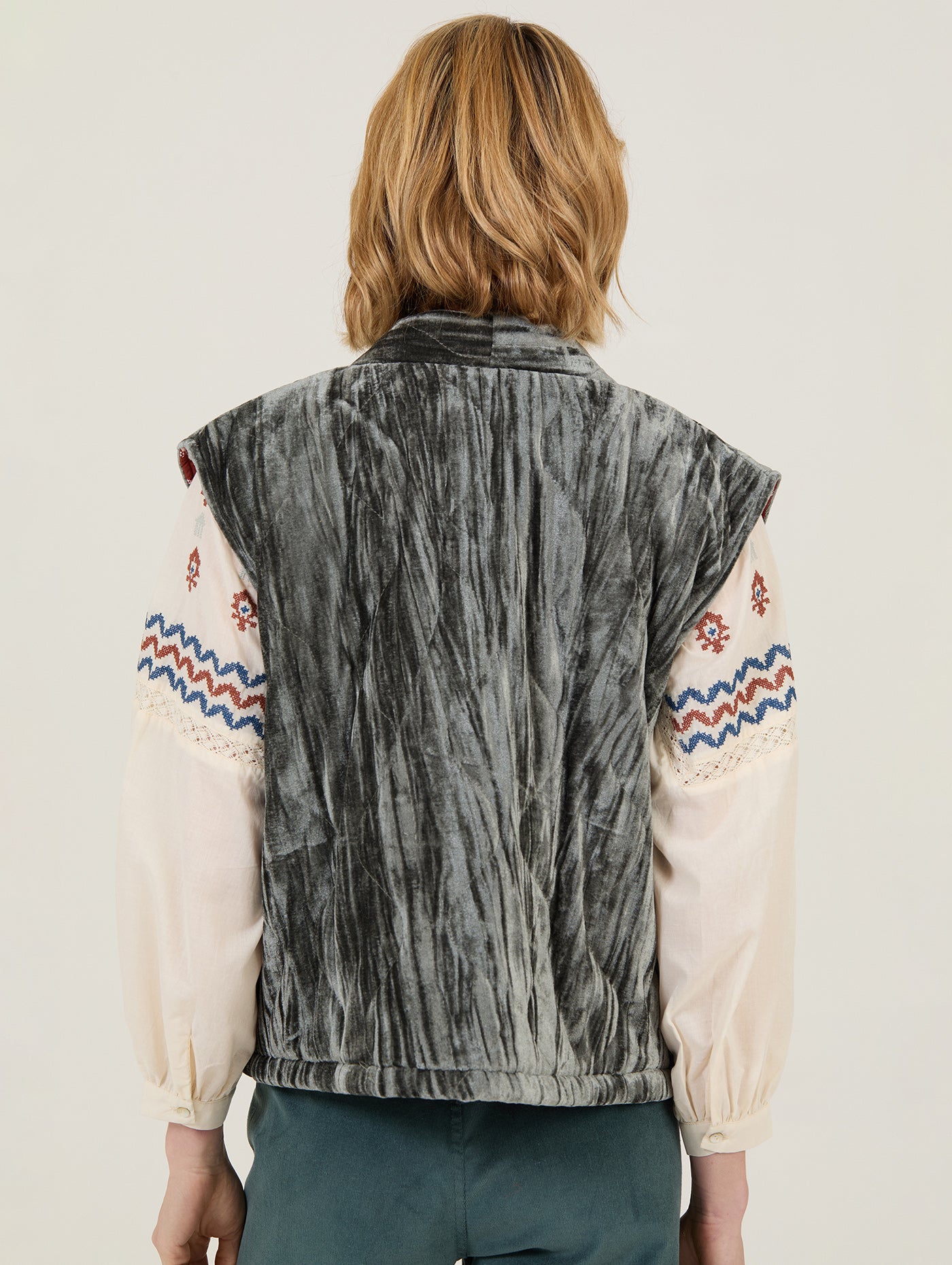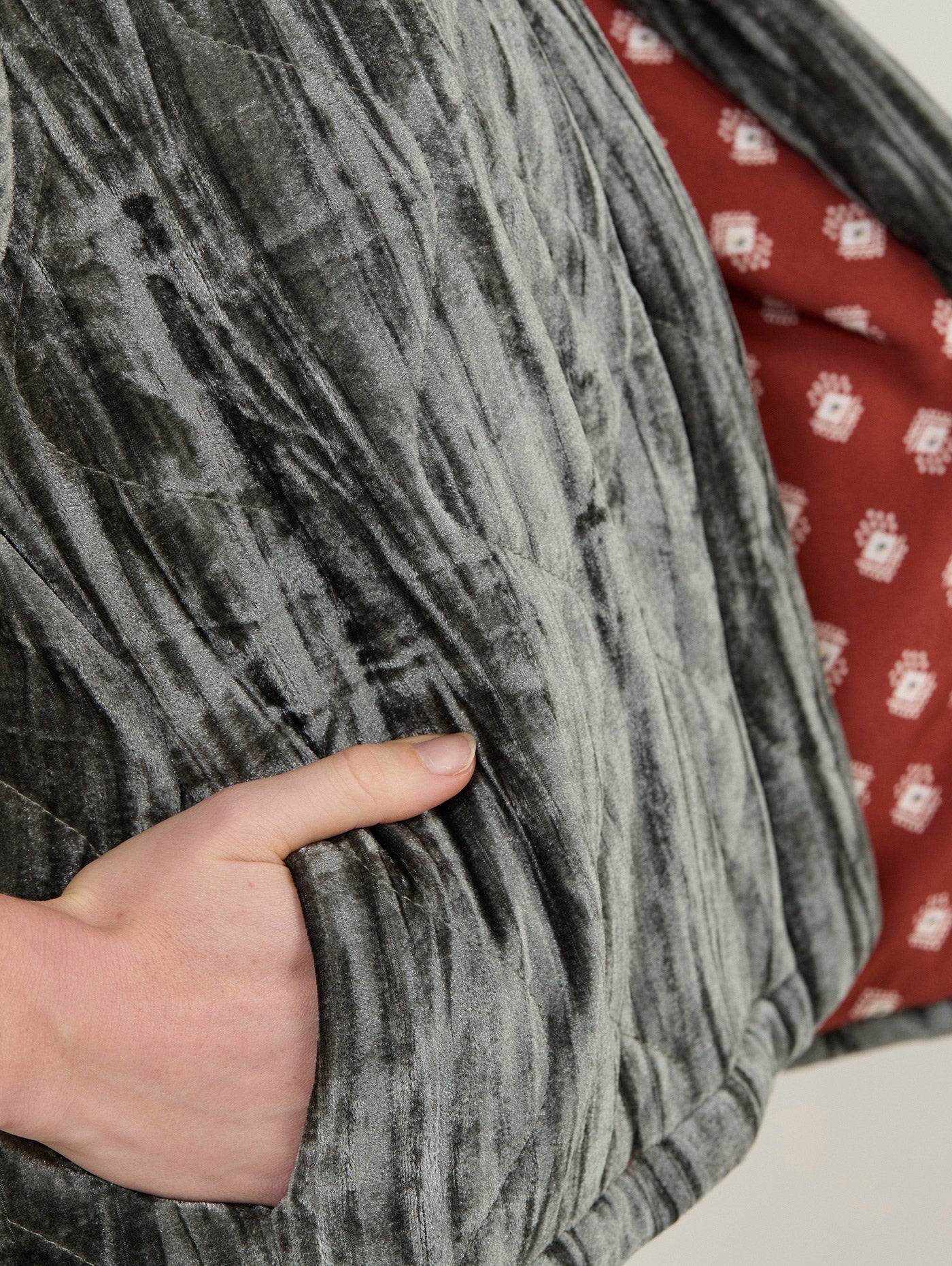 El chaleco acolchado de Meisie es la prenda perfecta para elevar cualquier look con un toque boho sofisticado. Confeccionado en un suave terciopelo gris con efecto arrugado, destaca por su forro interior con estampado étnico en tonos rojizos, que aporta un contraste lleno de personalidad.
