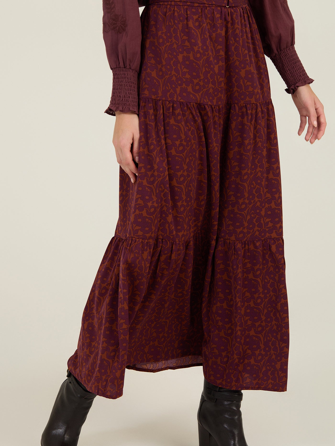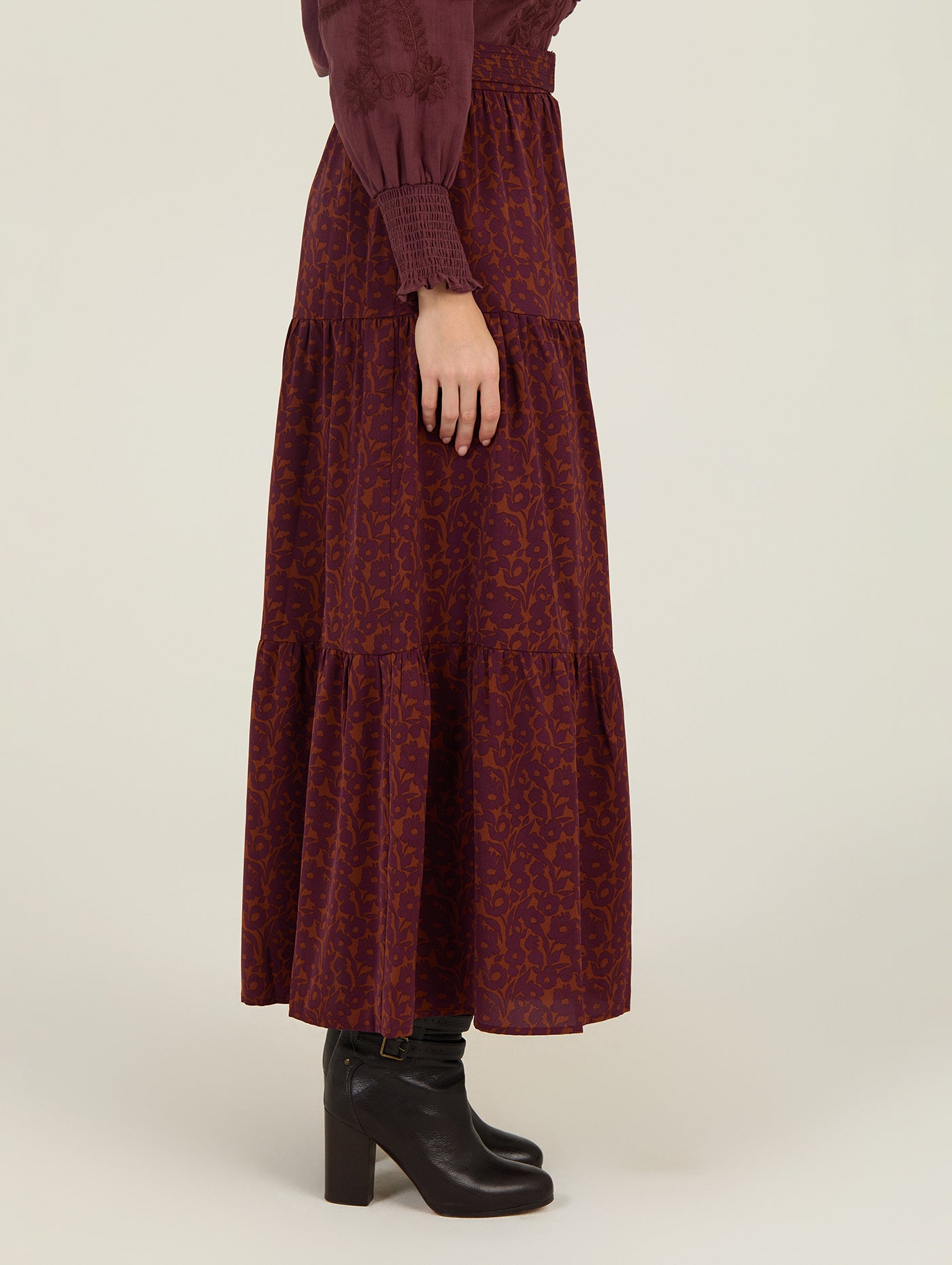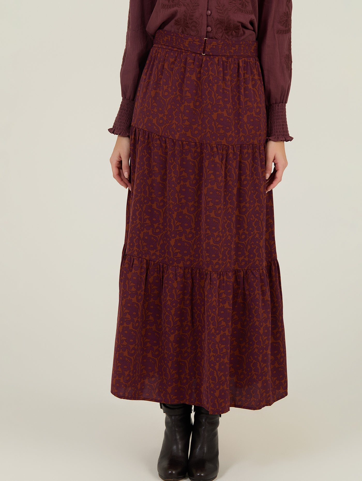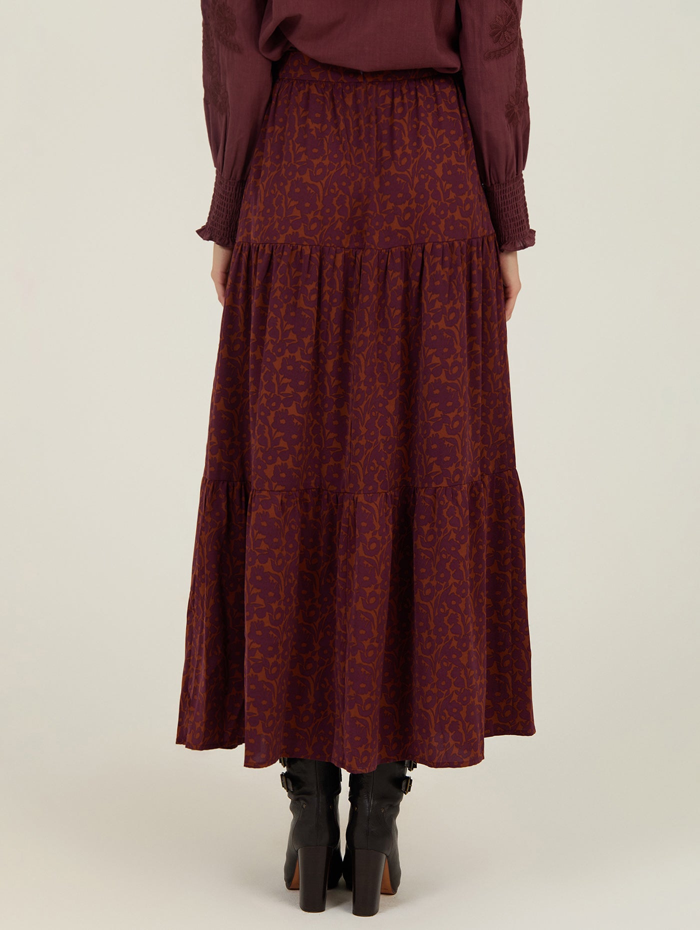 La falda larga de estampado floral de Meisie es una de esas prendas que respiran libertad y estilo en cada detalle. Su estampado floral en tonos burdeos y tierra aporta calidez y un toque artesanal, mientras que su corte midi con vuelo ligero y estructura en volantes crea un movimiento fluido al caminar.