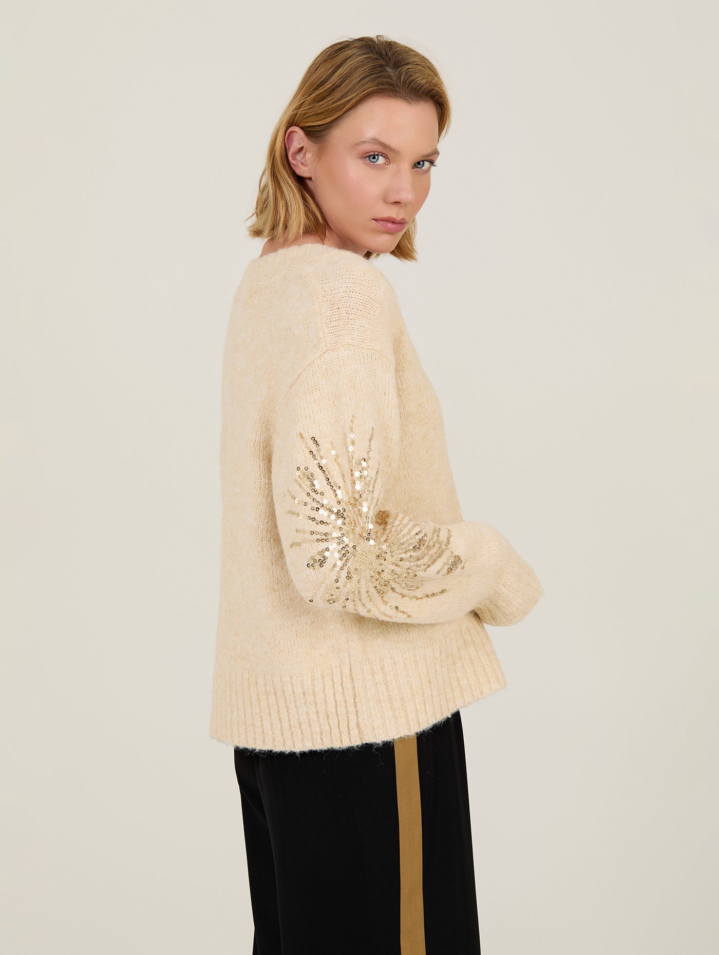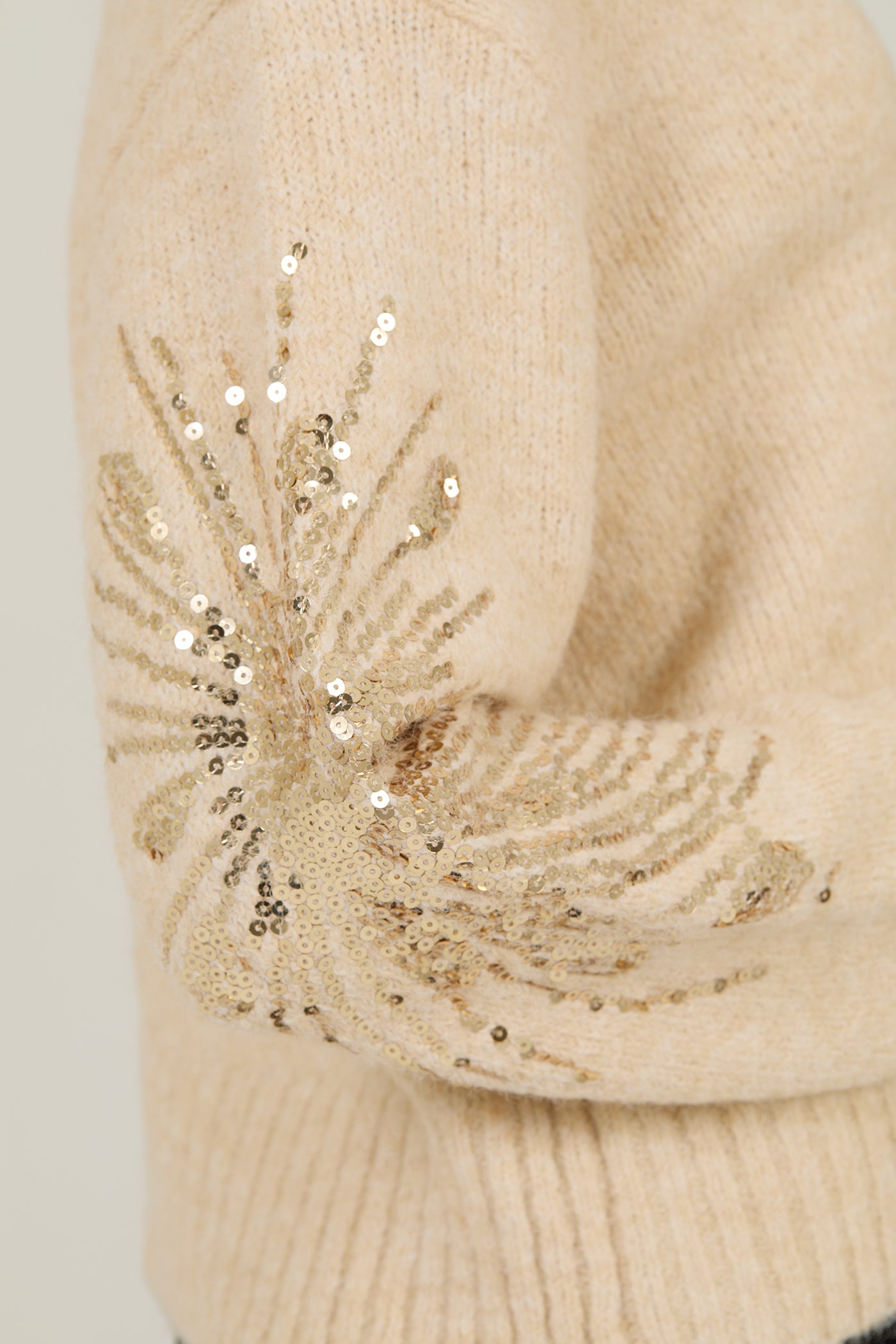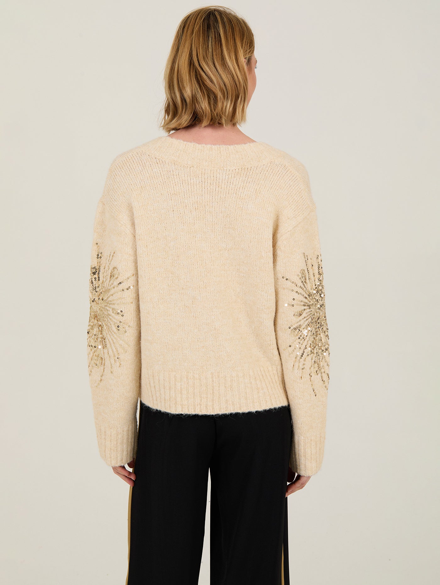 El jersey con lentejuelas es pura magia invernal: una prenda que combina la suavidad de su punto con el toque brillante de sus bordados de lentejuelas doradas en las mangas. Su tono beige cálido lo convierte en una pieza versátil, fácil de combinar y perfecta para elevar cualquier look con un aire sofisticado y relajado a la vez.