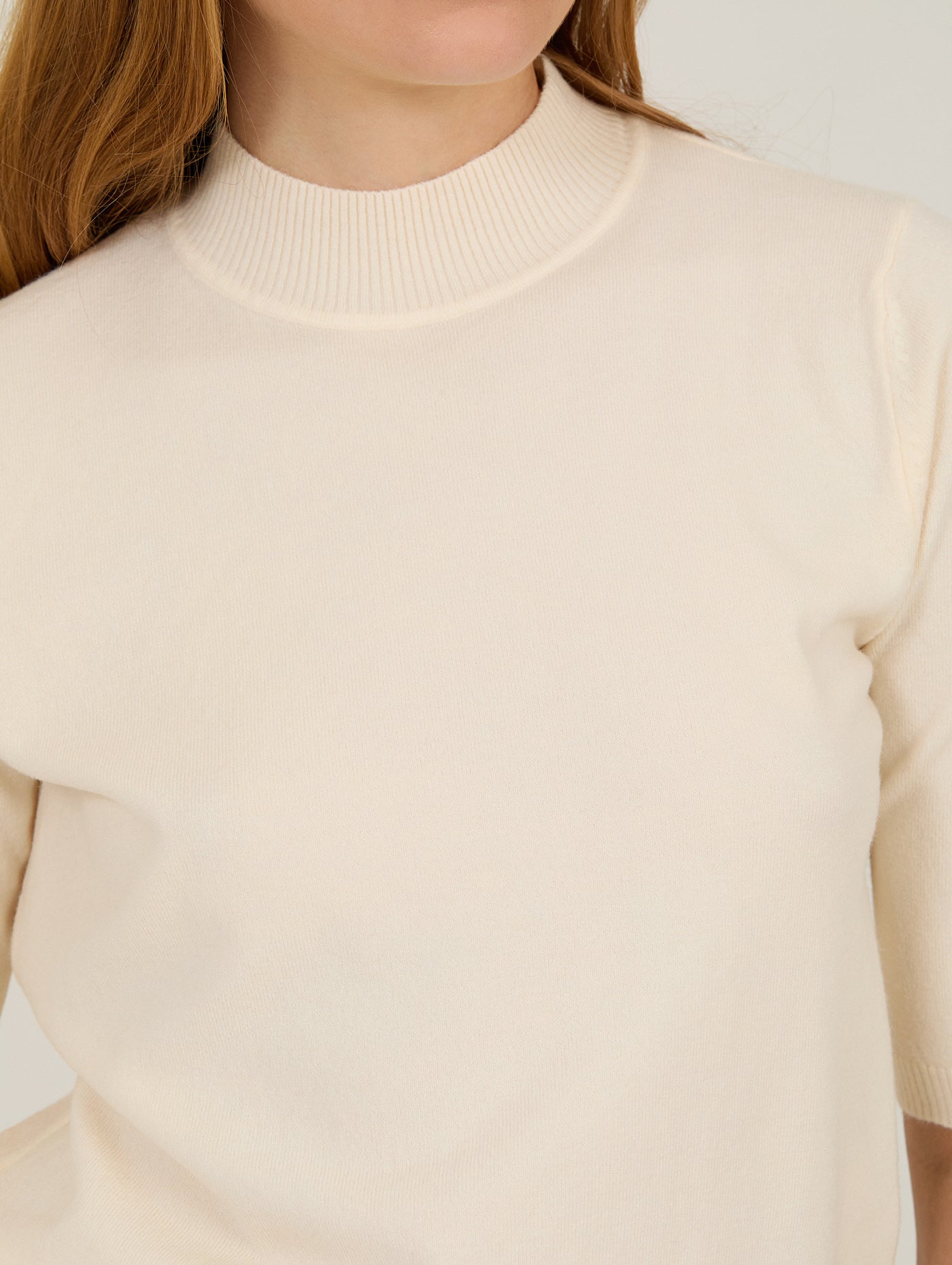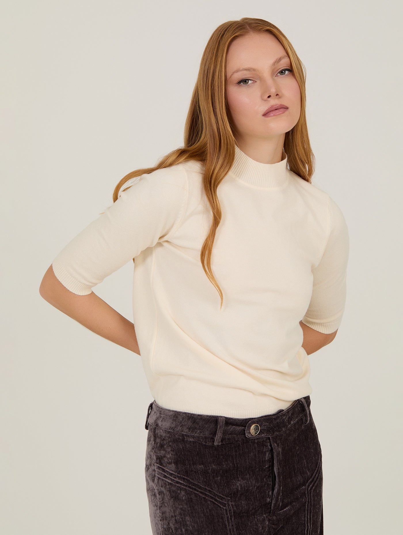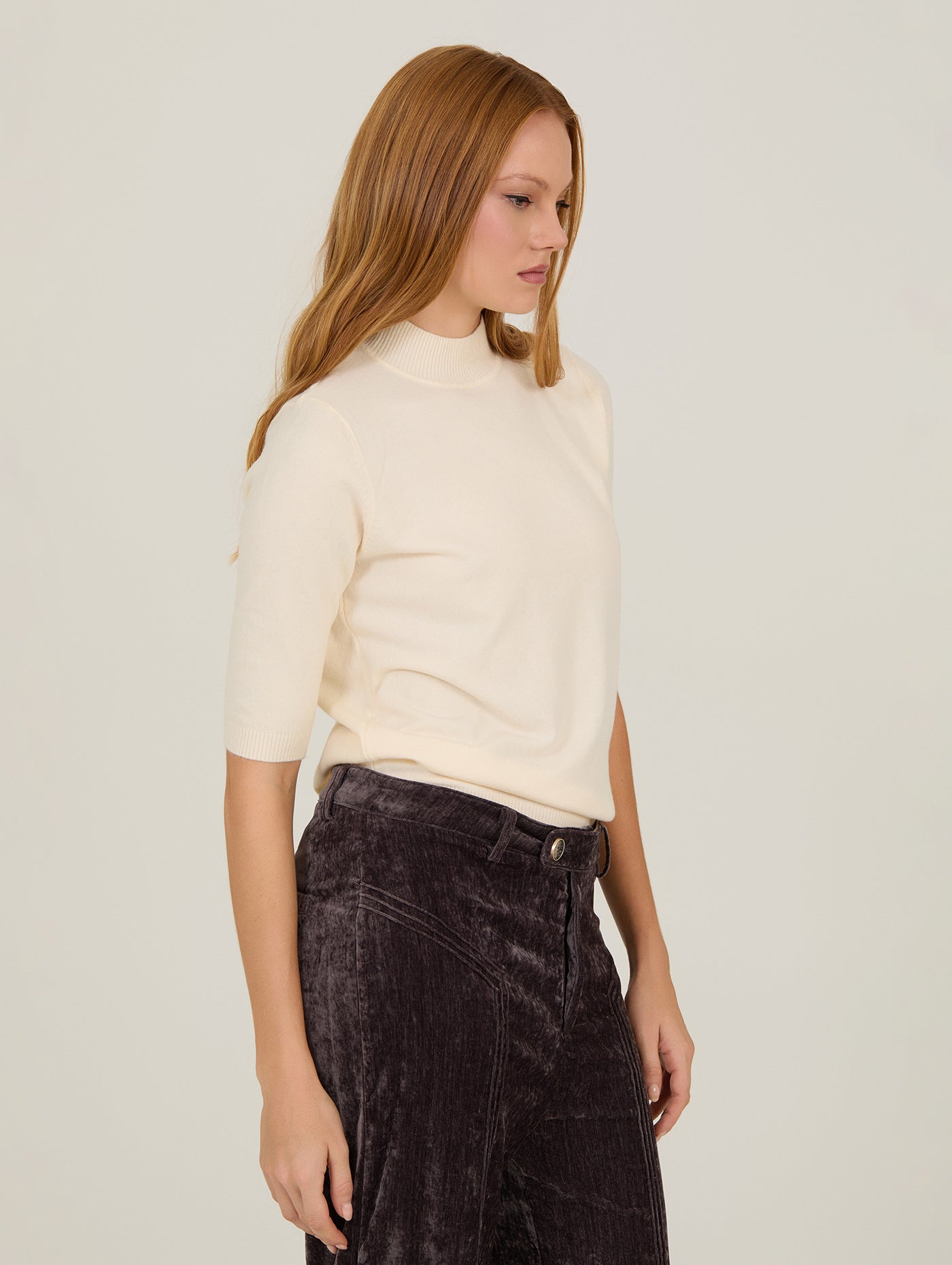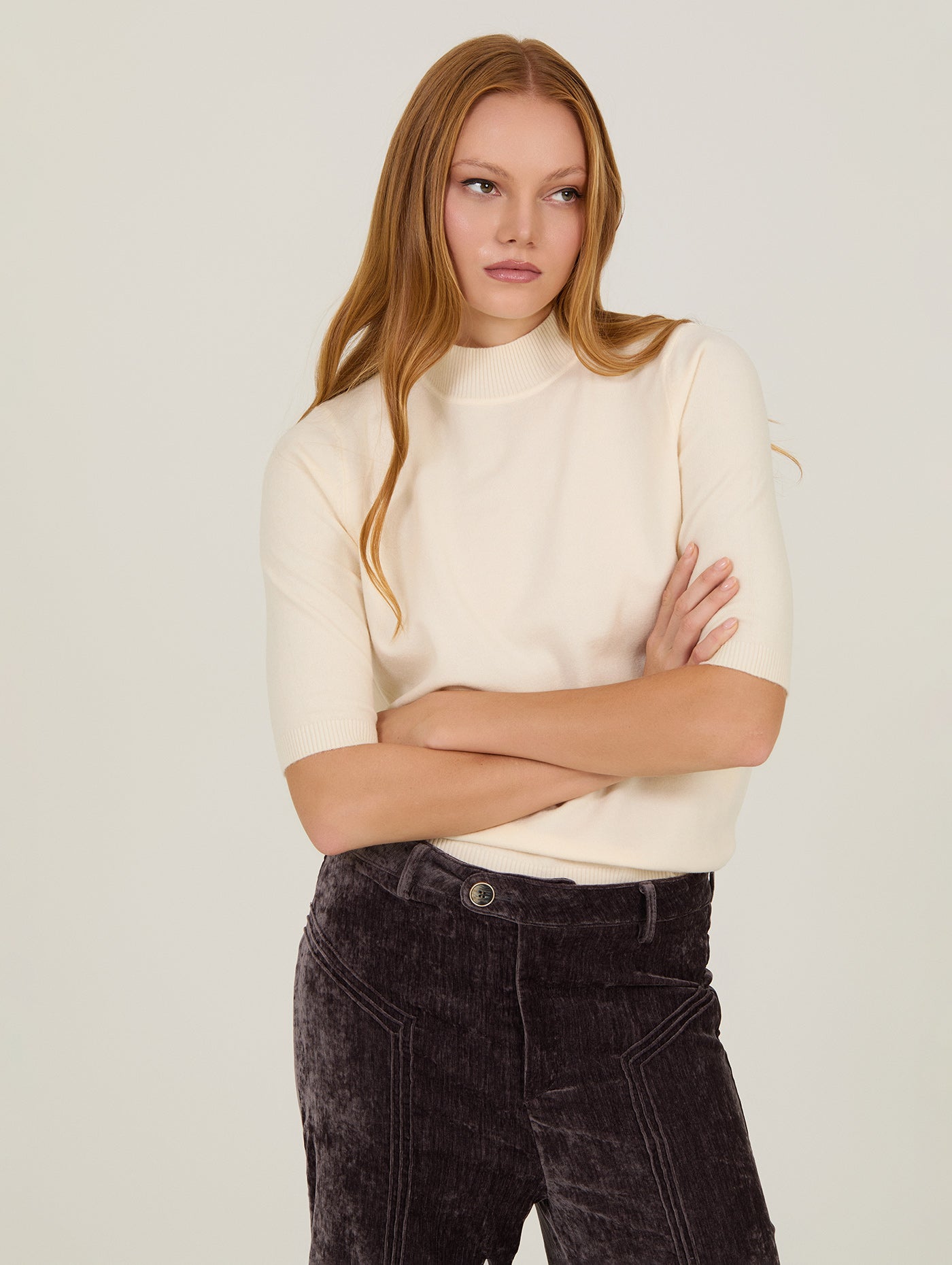 El diseño destaca por su cuello semi alto acanalado y sus mangas a media longitud, que aportan un aire elegante y contemporáneo. Ideal para combinar con faldas midi, pantalones de pana o bajo un chaleco boho, creando ese equilibrio perfecto entre comodidad y estilo.