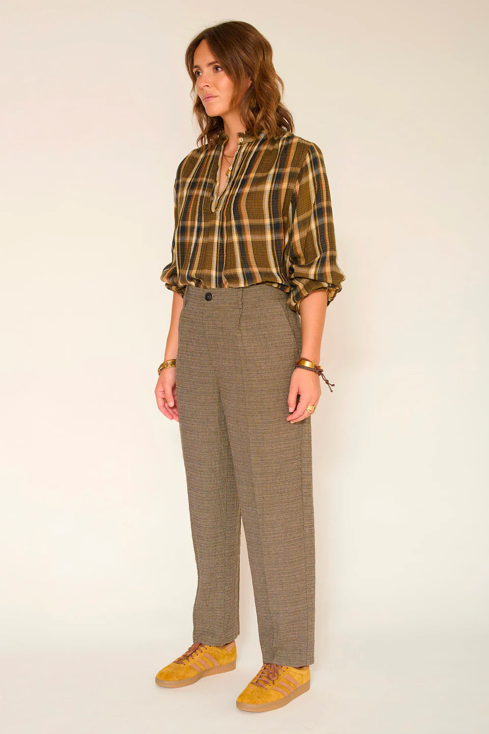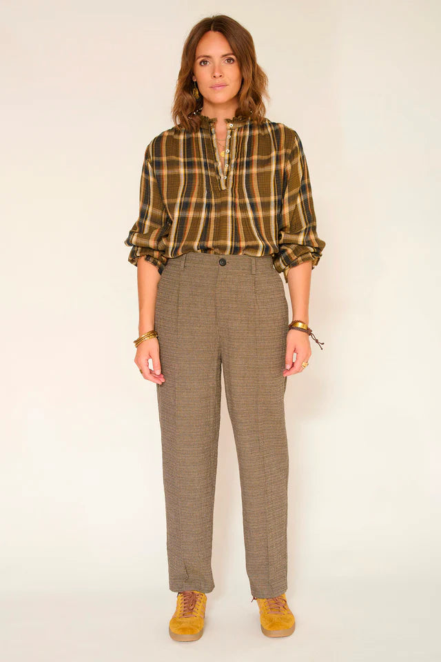 El pantalón Pepito de MKT Studio es la prenda que une elegancia y comodidad en un diseño de inspiración retro con aire contemporáneo. Confeccionado en tejido de cuadros discretos, su corte recto y fluido estiliza la silueta a la vez que aporta libertad de movimiento, convirtiéndolo en un básico versátil para looks de oficina o de estilo casual chic.