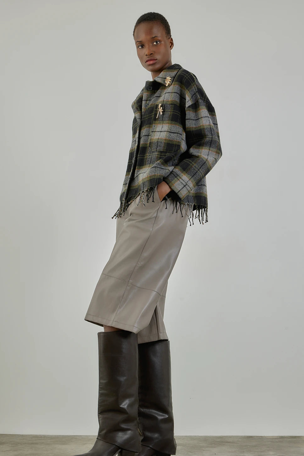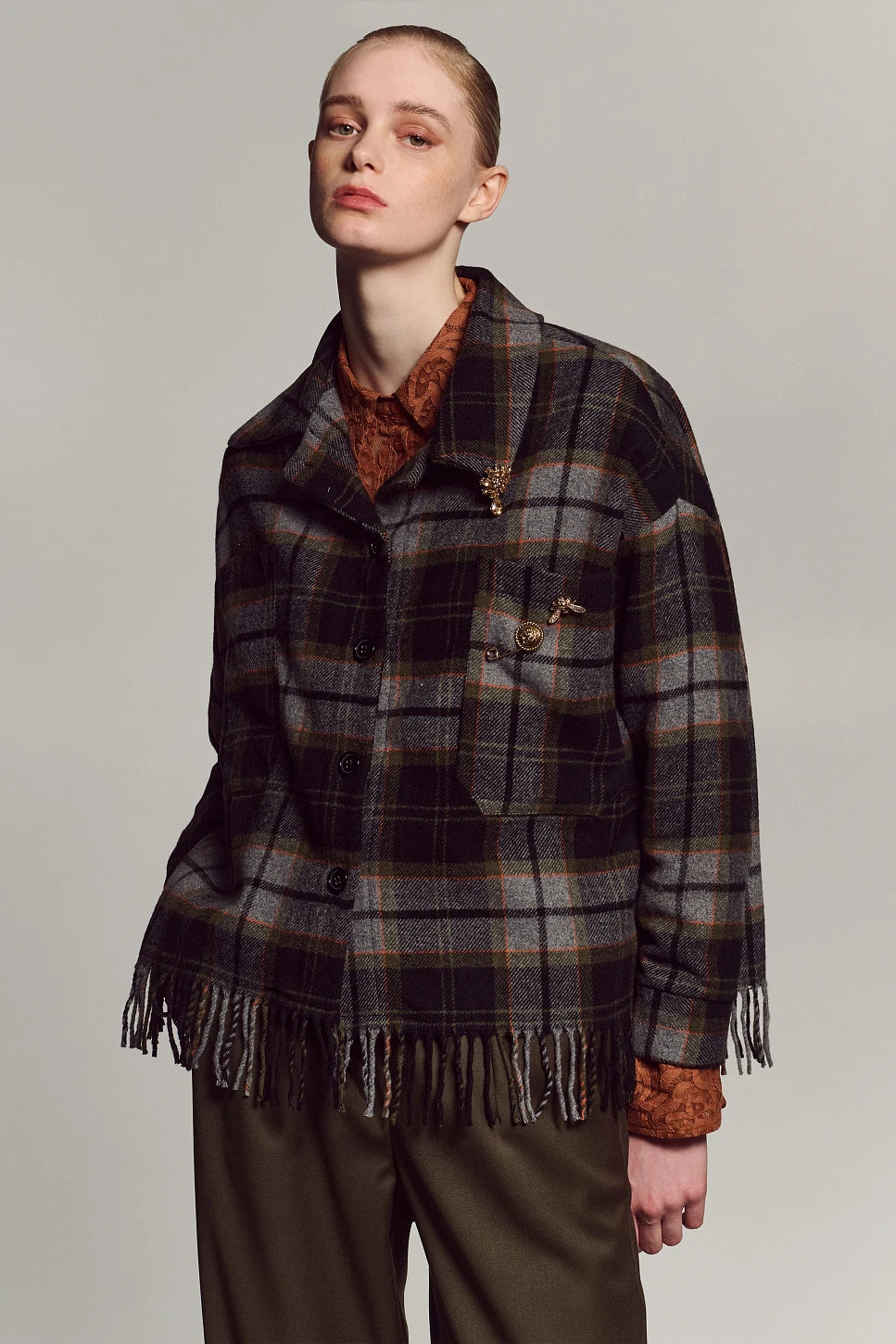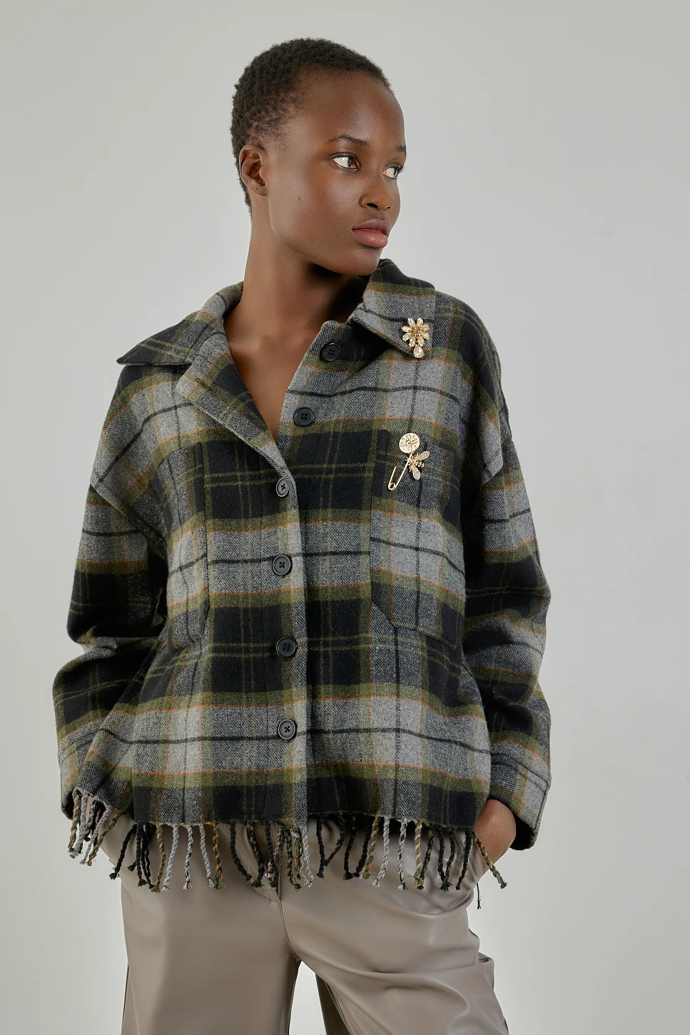 Sobrecamisa de cuadros en tonos verdes y grises, confeccionada en tejido cálido y suave, ideal para los meses de entretiempo y otoño-invierno. Su diseño combina un aire heritage y sofisticado con detalles joya que la hacen única: broches decorativos dorados en forma de flor, abeja y alfiler, que aportan un toque especial y femenino.