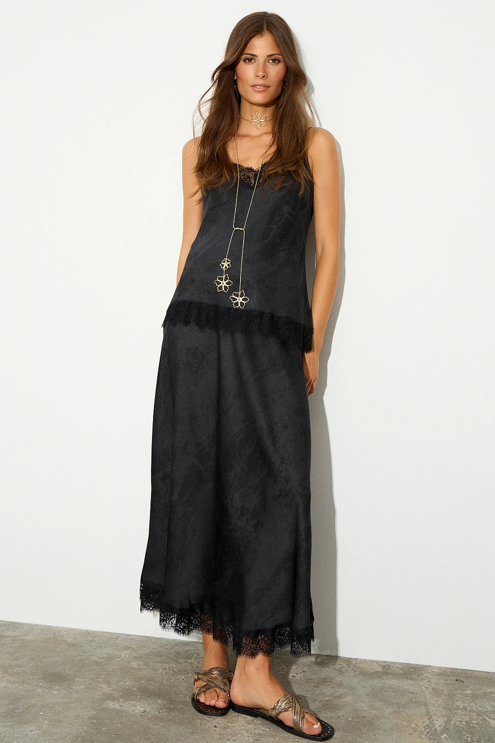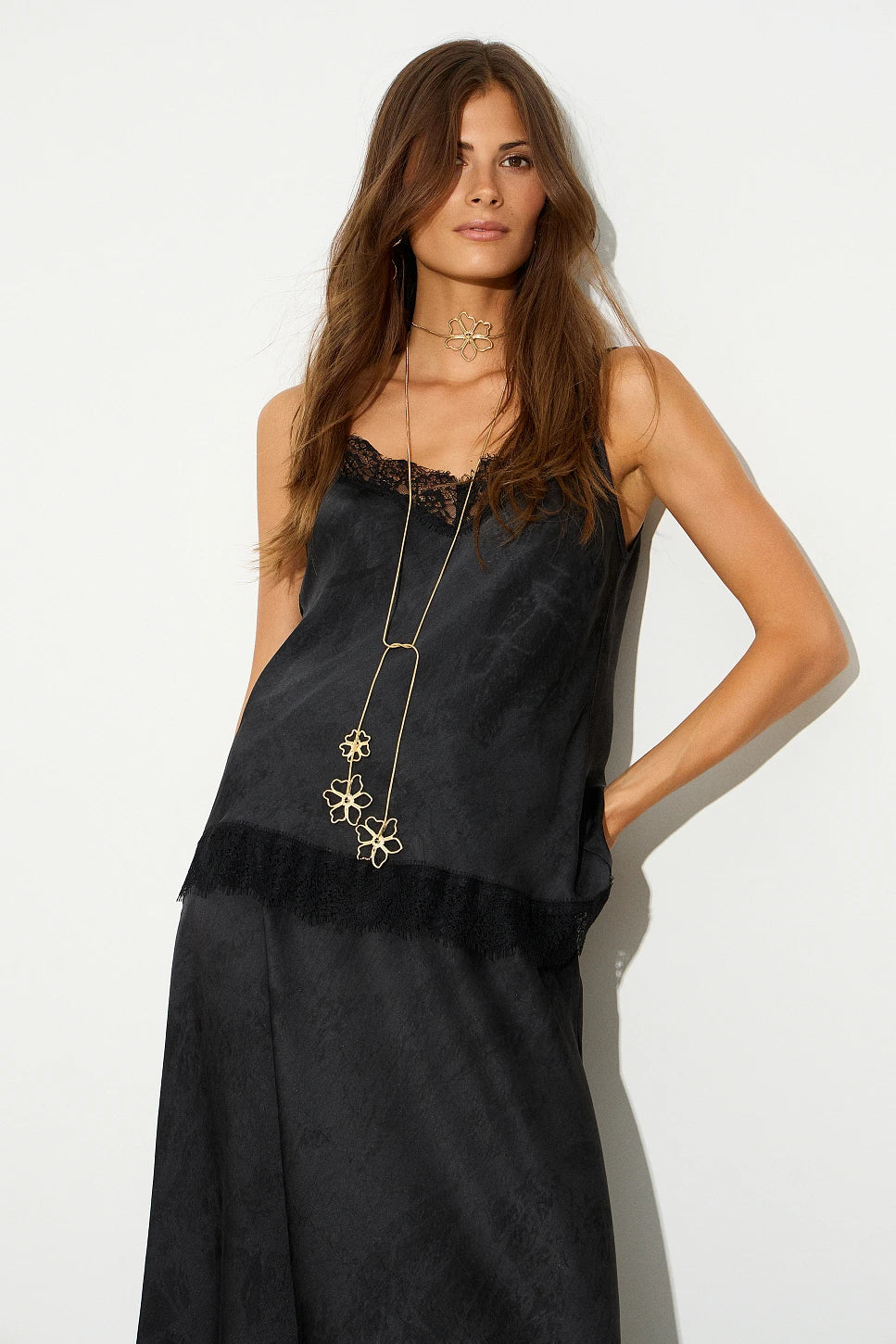 El detalle de encaje en el escote y el bajo realza su aire romántico y sensual, mientras que los tirantes finos regulables aseguran un ajuste perfecto y cómodo. Su caída fluida estiliza la silueta y lo hace ideal tanto para llevar con falda midi en un look de noche como con jeans y blazer para un estilo más urbano y actual.